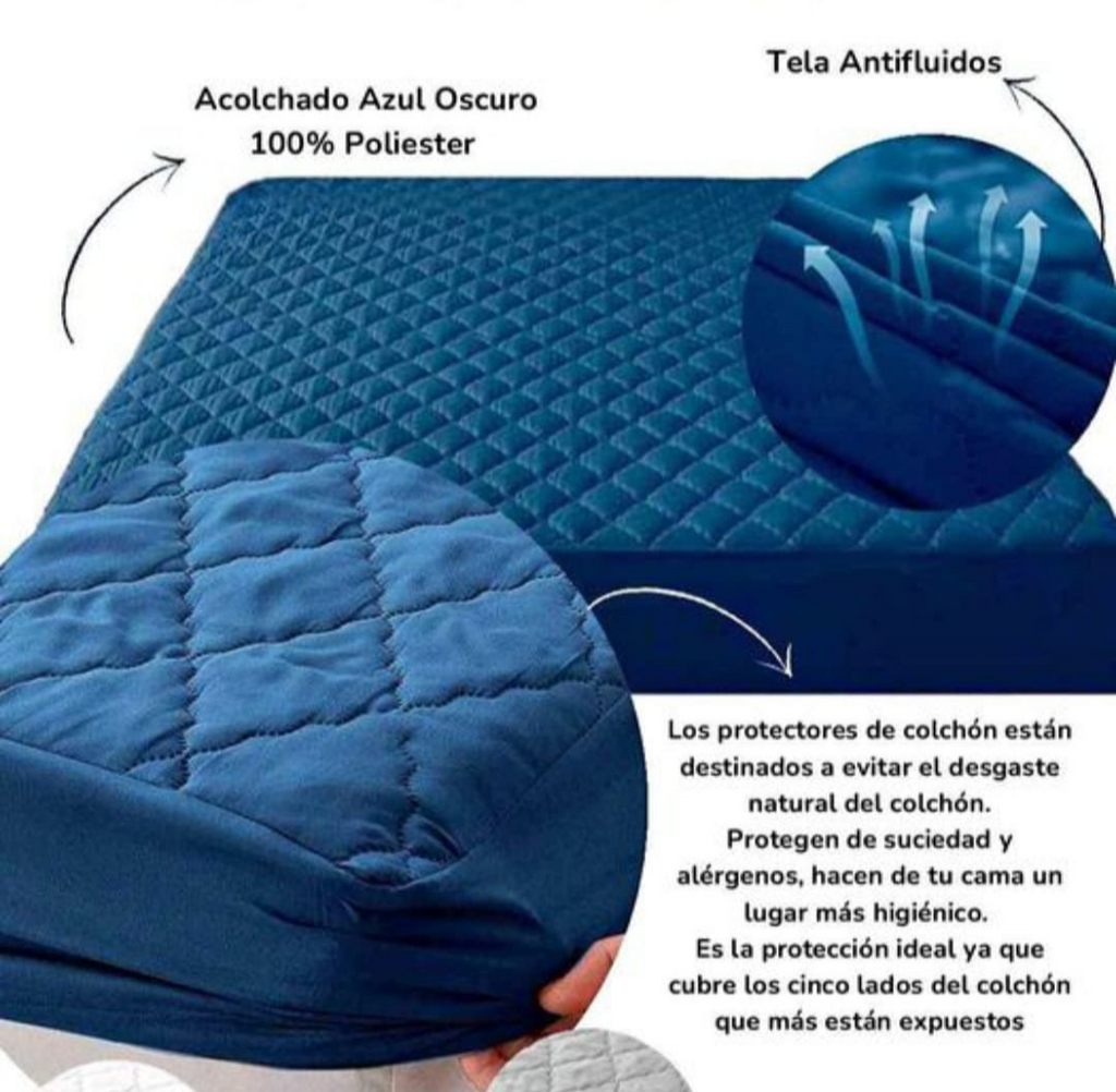 SOMOS FABRICANTES***STOCK REAL DISPONIBLE PARA ENVIO INMEDIATO***Ficha TécnicaCompuesto por tres capas de tela, microfibra poliéster, guata y tela antifluido, unidas mediante termosellado, destinado a evitar el desgaste natural del colchón.Protegen de suciedad, alérgenos, saliva, sudor y fluidos corporales, hacen de tu cama un lugar mas higiénico.Resorte en todo el contorno del protector de colchónBanda con altura de 40 cm (ideal para todo tipo de colchón)***NO ES IMPERMEABLE, ES ANTIFLUIDOS***MEDIDASSENCILLO: 100 cm *190cmSEMIDOBLE: 120 cm * 190cmDOBLE: 140 cm * 190cmQUEEN: 160 cm * 190cmKING: 200 cm * 200cmNOTA**Las imágenes utilizadas son de uso referencial, el diseño de la tela y el diseño del acolchado pueden variar dependiendo del stock disponible.El color de la tela puede variar levemente de acuerdo a la imagen de referencia y al stock disponible.La medida puede variar +/- 5 cmPreferiblemente despachar con las transportadoras Servientrega, Interrapidisimo y Coordinadora.